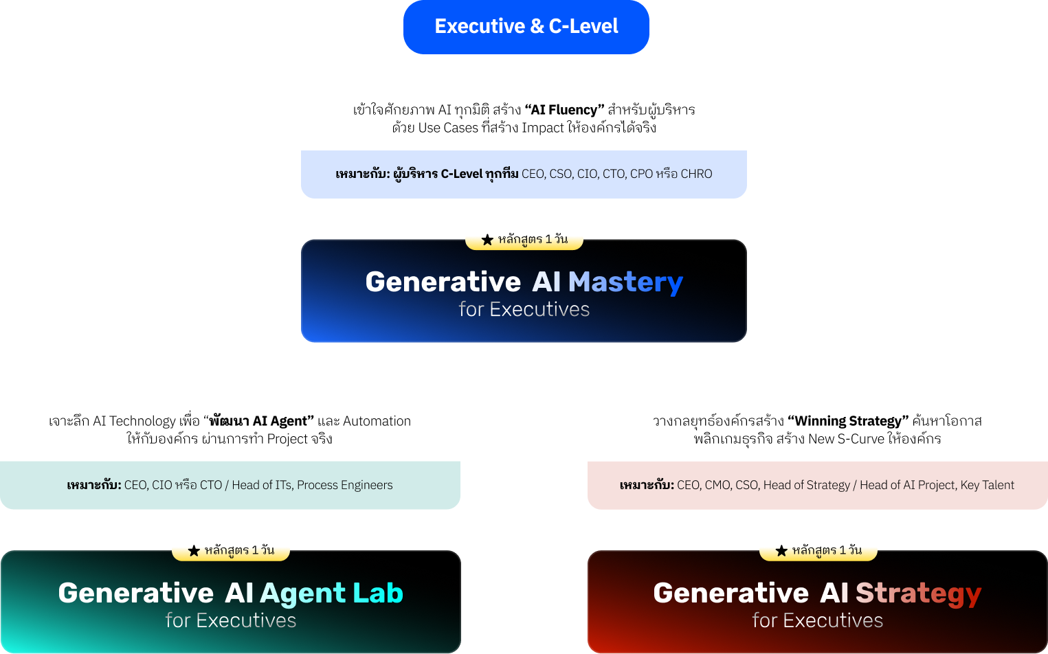 “ครบ จบในที่เดียว” พาผู้บริหารทุกท่านไปเปิดพรมแดนใหม่ เข้าใจ เทคโนโลยีสำคัญของ AI ผ่าน Use Cases จริงจากองค์กรไทย และ ต่างประเทศ พร้อมลงมือสัมผัสศักยภาพ และเข้าใจความเสี่ยงที่ต้อง คำนึงถึง ในการทำ AI Transformation ขององค์กรตนเอง