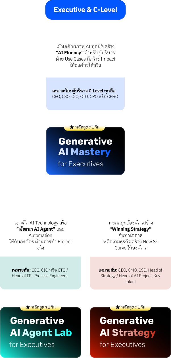 พาผู้บริหารองค์กรก้าวข้ามความไม่แน่นอนในยุค AI ด้วยความเข้าใจอย่างแท้จริง โดยหลักสูตรนี้ออกแบบมาเพื่อช่วยผู้นำ “มองภาพใหญ่” และ “ลงมือทำ” ผ่าน 3 แกนสำคัญ ที่จะช่วยวางแผนการนำ Generative AI ไป Transform องค์กร